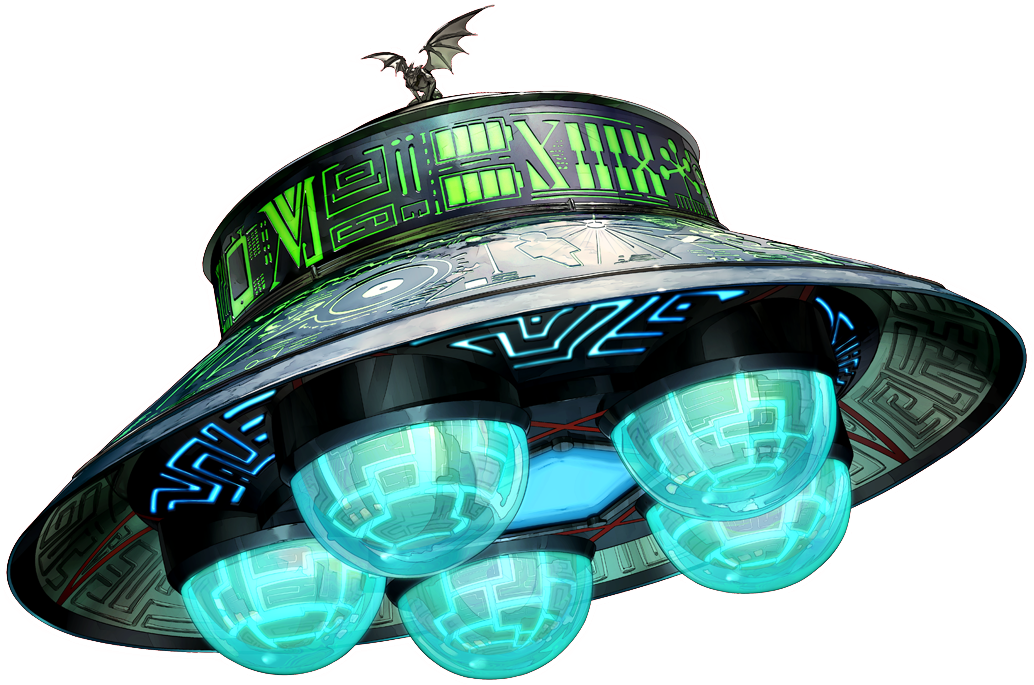 >This is Necronomicon, the initial Persona of Futaba. She was formed when Futaba regains her will to live and accepts her shadow self. Necronomicon has an appearance of an UFO with a metallic Gargoyle statue right on top of the roof.The outside design has a lime green glyphs of various origins. Futaba is shown to be the one whose piloting Necronomicon from the inside. This Persona symbolizes her unknown power and vast reserves of knowledge. Necronomicon is navigator type Persona with a limited type of skills by itself. Necronomicon was by inspired by a fictional grimoire (magic tome) featured in the work of horror by writer H.P. Lovercraft. The grimoire details how ancient aliens that inhabited Earth, manipulates humans for their own ends.